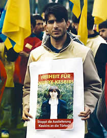 Jugendlicher auf dem Weg von Herford nach Gelsenkirchen mit Plakat für die Freiheit von Nuriye Kesbir. (Foto: isku)
