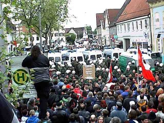 Dort konnten sie dann rund 500 Meter vom Bahnhof zur Ortsmitte marschieren und dort vor der Post eine 30minütige Kundgebung abhalten. Der überwiegende Teil der GegendemonstrantInnen wurden von der Polizei daran gehindert, in die Nähe des Platzes zu gelangen, ca. 100 anwesende Nazi-GegnerInnen versuchten trotzdem, mit Trommeln, Sprechchören und Trillerpfeifen die Kundgebung zu stören. Der Abmarsch verlief dann fast ungestört, die starken Polizeikräfte lösten kurzfristige Blockadeversuche von AntifaschistInnen sofort auf.