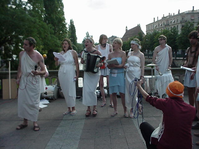 Allerdings gelang es AktivistInnen in der Strasbourger Innenstadt mit kleinen Aktionen auf sich und ihre Anliegen aufmerksam zu machen: obwohl an jeder Strassenecke und auf jeder Brücke Riot-Cops positionert waren, konnten Transparente (z.B. auf einer Touristen-Bootsrundfahrt unter diesen Brücken hindurch) gezeigt werden oder mit einer weiteren Theatergruppe ein Stück gegen Rasssismus aufgeführt werden.