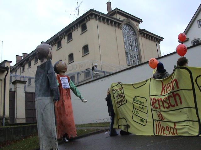 Zur Kundgebung sammelten sich knapp 50 Personen auf dem Rottenburger Marktplatz.Nach einem Vertreter des Buendnisses gegen Abschiebehaft sprach ein kurdischer Fluechtling, der selbst vor wenigen Wochen fuer einige Tage im Rottenburger Abschiebegefaengnis sass, bevor er, auch wegen massivem oeffentlichen Druck verschiedener politischer Initiativen, wieder freikam (vgl. www.social-forum.de). Von Kein Mensch Ist Illegal wurde in einem Theaterstueck das Leben und Denken von Gitterstaeben in Abschiebegefaengnissen dargestellt, mit Verweisen auf deutsches Pflicht-, Moral- und Arbeitsbewusstsein, und der abschliessenden Flucht der Gitterstaebe von ihrem Arbeitsplatz Knast.