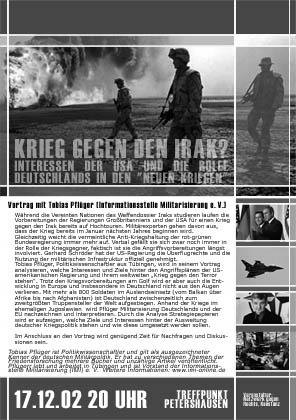 Das Netzwerk gegen Rechts lädt zu einer Vortragsveranstaltung am kommenden Dienstag, den 17.12.02 zum Thema 'Krieg im Irak' mit dem Politikwissenschaftler Tobias Pflüger ein.