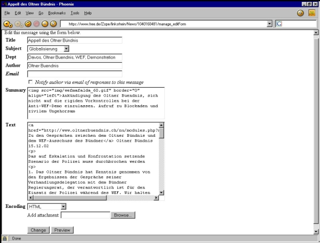 Natürlich kann auch der oder die Administratorin jederzeit of postings zugreifen und sie editieren. Dazu gehört z.B. die Koorektur von fehlerhaften HTML-Code, unschönem Layout oder Ergänzung von Schlagworten. Wenn er oder sie Lust hat, kann er/sie auch ein kleines Bild für die Startseite basteln. Das muss dann zunächst als 'von Hand' nach Zope hochgeladen werden (sieh nächstes Bild) um sodann per HTML-Codierung (<img src="" border=0 align=left>) in das Beschreibungs-Feld eingebunden zu werden. Wichtig ist, dass wenn HTML-Code eingesetzt wird, die Encoding-Auswahl ebenfalls auf 'HTML' steht.