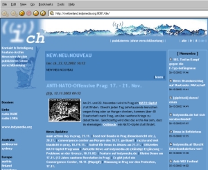 Hinter den Kulissen wurde aber offensichtlich gearbeitet, denn das neue Erscheinungsbild das seit dem 23.12.2002 zu sehen ist, ist ansprechend. ((i))ch ist jetzt wirklich mehrsprachig (deutsch, französisch und italienisch) und die Navigation ist sogar besser als bei den anderen Indymedia Servern, bei denen 'mir' eingesetzt wird: es können selbst lange zurück liegende News oder Startseiten-Features bequem über einen kleinen Index angesteuert werden. Der Datenbestand ist aber offensichtlich nach wie vor reduziert auf die Postings nach der Auszeit in Folge der heftigen Auseinandersetzungen um die Behandlung von antisemitischen Postings bei Indymedia Schweiz.