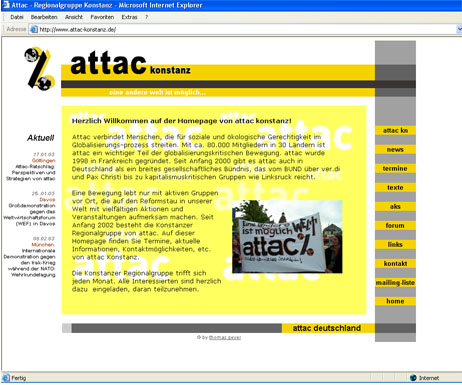 Seit dem 01.01.03 ist sie endlich online: die Homepage der Konstanzer Regionalgruppe von attac. www.attac-konstanz.de