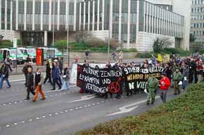 Die Demonstration durch die Aachener Innenstadt vermittelte ein sehr entschlossenes und kämpferisches Bild vom notwendigen Kampf um selbstverwaltete Freiräume. Die DemonstrantInnen skandierten u.a. "Goethestraße bleibt!", "Kein Tag ohne Autonomes Zentrum", "Autonome Zentren erkämpfen und verteidigen!", "Wohnungsnot muß nicht sein: zieht in leere Häuser ein!" und "no nation - no border - fight law and order".