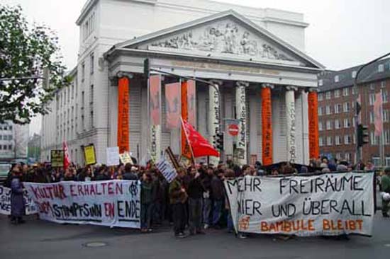 Gleichzeitig übte die Demo Solidarität mit anderen bedrohten oder bereits von der Polizei zerschlagenen kulturellen, sozialen, politischen Einrichtungen und alternativen Wohnprojekten. Grußworte wurden mit einer Großdemonstration von 5000 TeilnehmerInnen in Hamburg ausgetauscht, die sich gegen die Räumung des Bauwagenplatzes "Bambule" in der Hamburger Innenstadt richtete.