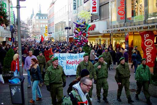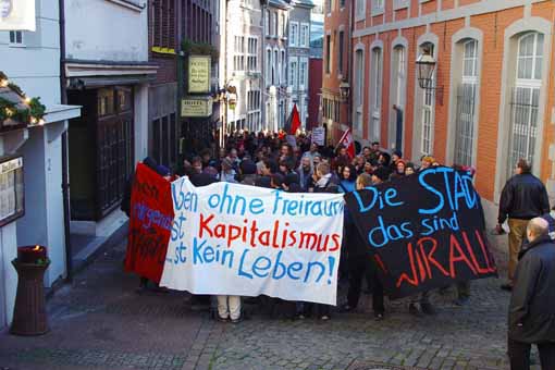 Zum Auftakt der heutigen Demonstration versammelten sich gegen 13.00 Uhr etwa 230 TeilnehmerInnen am Aachener Markt. Diese Zahl wuchs im Verlauf der Demonstration auf 370 TeilnehmerInnen an, da sich viele PassantInnen spontan dem Demonstrationszug anschlossen.