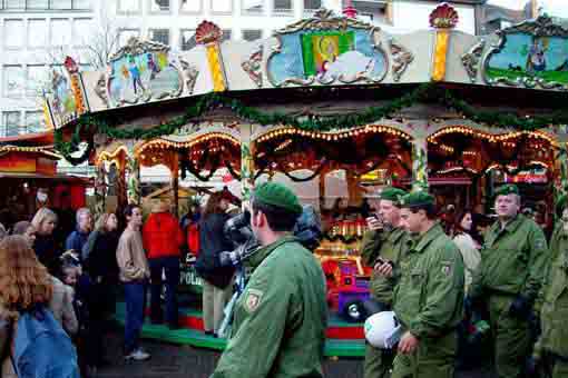 Anschließend ging es weiter zum geschlossenen Autonomen Zentrum, wo ein Zwischenstopp eingelegt wurde. Über Horngasse, Theaterstraße. Hartmannstraße und Krämerstraße zog die Demonstration zurück zum Markt. In den engen Gassen zwischen den Buden des Weihnachtsmarktes plante die Polizei offenbar eine weitere Verschärfung der Provokationen. Zahlreiche Zivilbeamte wurden hier zusammengezogen und umringten Teile der Demonstration. Die DemonstrantInnen entzogen sich auch hier der Eskalation, indem sie ihren Weg in die Pontstraße fortsetzten.