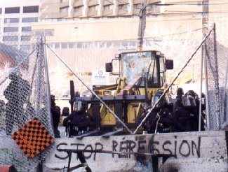 Malgré leurs 6500 flics (incluant 1500 affectés à l'anti-émeute), leurs 1200 militaires, leurs dépenses d'au moins 70 millions $ en mesures de sécurité, il n'aura fallut qu'un seul manifestant bien déterminé, épaulé par une poignée de camarades, pour faire chuter un pan complet de la clôture sur la rue René Lévesque!!! Depuis le milieu de l'après-midi, la clôture de 4 km qui ceinture le périmètre de sécurité a été attaquée sur quatre fronts, soit sur le boulevard René-Lévesque, la côte d'Abraham, la rue Dufrain et la Grande Allée. C'est ainsi plus de 100 mètres de distance de la clôture furent abattus par les opposantEs à quelques pas du Centre des congrès.