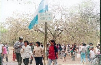 - Man braucht nur einen kleinen Bergrücken hinaufzugehen, weiter nichts. Der Ort heißt einfach La Loma (= Bergrücken od. Hügel) und es sind 200 Meter eines Abhangs. Sie verloren ihre Wohnungen, aber nicht den Besitz, sie haben das Land weiter genutzt. Wir gingen zu Rechtsberatungen, von Rechtsanwälten und all das, und die Berater gaben uns ihre Sicht der Lage, und ihre Meinung ist, daß sie (die Guaraní) im Besitz des Landes seien. Deshalb trafen die Leute selbst die Entscheidung, wieder hinzugehen. So wohnten sie also dort und gestern nachmittag gab es einen Polizeieinsatz mit einem Haufen von Polizeikräften, und sie fingen an, die Leute anzugreifen, sie zu schlagen, sie zu mißhandeln, Frauen und Kinder zu schlagen.
