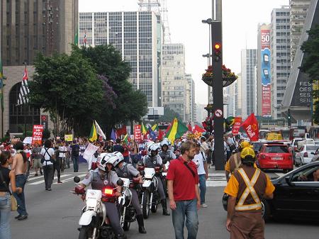 Milhares de pessoas nas ruas de São Paulo no Dia Internacional das Mulheres, que aconteceu junto com o protesto contra a visita do Imperador Bush ao Brasil.