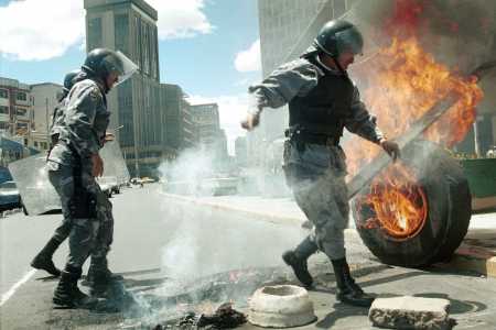 | Police officer extinguish fire on a street during a national strike called by Union leftists against the goverment of President Gustavo Noboa in Quito, Ecuador Wednesday Feb. 7, 2001. (AP Photo) |