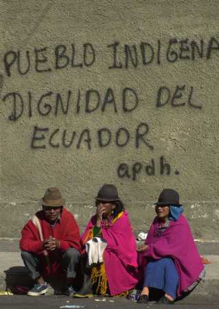 | Ecuadorean Indians wait for news outside Salesiana University in Quito, Ecuador, Wednesday, Feb. 7, 2001. Ecuadorean President Gustavo Noboa and Indian leaders are negotiating an end to violent protests against recent government-mandated bus fare hikes and fuel subsidy cuts. Thousands from the countryside have occupied the university, using it as a base for demonstrations against the government. Grafitti reads, "Indigenous people - the dignity of Ecuador." |