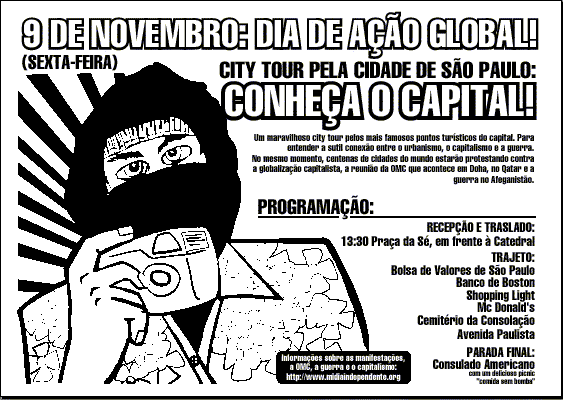 A agéncia de turismo Ação Global dos Povos, uma multinacional há trés anos no mercado, convida vocé para um maravilhoso city tour pela cidade de São Paulo. Nesse city tour, vocé conhecerá alguns dos mais famosos pontos turísticos do capital e entenderá a sutil conexão entre o urbanismo, o capitalismo e a guerra. No mesmo momento, centenas de cidades do mundo estarão protestando contra a globalização capitalista, a reunião da OMC que acontece em Doha, no Qatar e a guerra no Afeguenistão.
