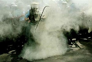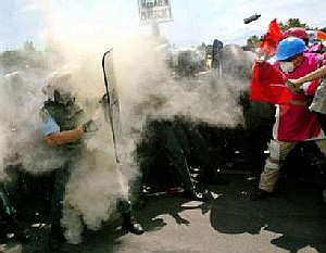 The red zone was attacked. The police fought the demonstrators, including the Disobedienti, off with CS-gas. Another demonstration went to the Macedonian/Greek Border to support the Roma in the refugee camp with food and medicine, but the activists were refused entry to Macedonia.