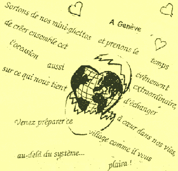 - Pour donner aux multiples groupes vivant et luttant à Genève l'occasion de créer un espace convivial dans le village, un village fait de nos différences, où chaque groupe vient avec ses amis, ses idées, ses envies et son propre matériel (thé, tapis, musiques, décorations, etc... / tables, bancs et feux seront organisés centralement).