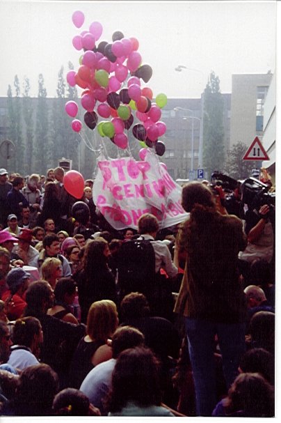 Beyond we gathered at he opposite site of the ministery of interior, in the Letna park, accompaigned by the Infernal Noise Brigade with its drummers. We made a collection for the czech arrested (they where the majority).