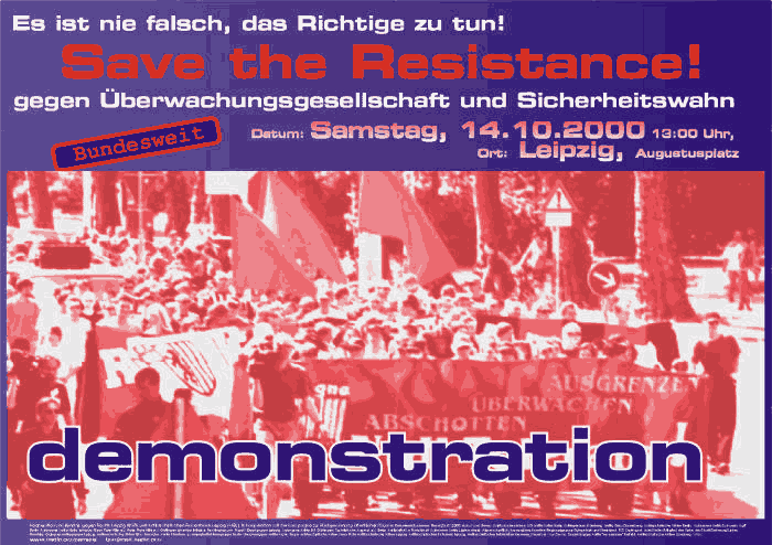 ![]() » Es ist nie falsch das Richtige zu tun [Al Bundy] - Save the Resistance! - Gegen Überwachungsgesellschaft und Sicherheitswahn « Antifa-Aufruf Download* als RTF - Download* als PDF » It is never wrong to do the right thing! - Save the Resistance! - Against a surveillance society and obsession with security « appeal Download* as RTF - Download* as PDF » Es ist nie falsch das Richtige zu tun [Al Bundy] - Save the Resistance! - Gegen Überwachungsgesellschaft und Sicherheitswahn « Kurzaufruf Download* als RTF - Download* als PDF » It is never wrong to do the right thing! - Save the Resistance! - Against a surveillance society and obsession with security « short appeal Download* as RTF - Download* as PDF Das Plakat» Save the Resistance! « Bündnisaufruf Download* als RTF - Download* als PDF » Save the Resistance! « Reader gegen den Sicherheitswahn Download* als HTML-Version - Download* als PDF - Anzeige für den Reader zum Download » Nach der Demo ist vor der Organisierung! « Nachbereitungspapier ![]() Redebeiträge am 14.10.2000 auf der Demonstration in Leipzig: » Save the resistance! « Redebeitrag vom Bündnis gegen Rechts und Antifaschistischem Frauenblock » Racist Everyday Life in Germany – How Refugees are Kept Under Surveillance « speech from Kahina » Ankunft im rassistischen Alltag – Überwachung und Kontrolle von Flüchtlingen in der BRD « Redebeitrag von Kahina » Speech in Leipzig on the occasion of a demonstration against Abuses of State control « speech from The Voice e.V. » Eure Sicherheit kotzt uns an! « Redebeitrag vom Leipziger Frauenkoordinierungstreffen » Kampf der Überwachungsgesellschaft! - Widerstand und Perspektive « Redebeitrag von der Autonomen Antifa [M] aus Göttingen ![]() » Knüppelpogo in Leipzig « vom Red Star Supporters Club » USK, SEK, Kamera - Wie mit unliebsamen Demos umgegangen wird « vom BAFF (Bündnis Aktiver Fusball Fans) » Kamera läuft - Action! « aus Einsatz #47 Den Antifa-Aufruf unterstützen: Antifa Aschersleben, Antifa Bergheim und Umgebung, Antifaschistische Aktion Berlin, AgiP Berlin, exinnendtadtaktionsgruppe Berlin, Antifaschistische Initiative Moabit (Berlin), Rave gegen Rechts Berlin, Antifa Jugendfront (AJF) Berlin, Treptower Antifa Gruppe (Berlin), Antifaschistische Aktion Borna, AntiFa Castrop-Rauxel, Antifa Grisu Danneberg, Antifa Duisburg, Unabhängiges Antifa Archiv Essen, Infobüro Gera, Autonome Antifa [M] Göttingen, Rote Hilfe Göttingen, AG Antifa/Antira Halle, Autonome Antifa Halle, Rote Hilfe e.V. Halle, Rote Flora Hamburg, Unabhängige Antifa Herne, Anarchist Black Cross Innsbruck, Antifaschistische Aktion Jena, Grünauer Antifagruppe Leipzig, Klarofix/Druckgruppe Leipzig, Rote Antifaschistische Aktion Leipzig, Antifaschistisches Schulnetz Leipzig, Antifaschistisches Infotelefon/Gamma-Newsflyer Leipzig, Autonome Antifa Lüdenscheid, Antifa Jugendgruppe Lüneburg, Autonome Gruppe M2 Mainz, Antifa Merseburg, Rabenschwarz Merseburg, Antifaschistische Aktion Mühlheim, Antifa Nierstein, Rote Antifa Nürnberg, Antifaplenum Nürnberg, Jugendantifa Nürnberg, Rote Hilfe e.V. Potsdam, Libertäre Initiative Recklinghausen, Antifainitiative Rudolstadt, Antifa Saalfeld, Autonome Antifa Schwerin, Antifaschistische Aktion Ulm / Neu-Ulm, Infoladen Ludwigsburg, AntifaschistInnen Bietigheim, Innen!Stadt!Aktion! Hannover, Offene Antifa Münster Den Bündnis-Aufruf unterstützen: Astrid Keller (Mitglied des Rates der Stadt Dortmund/Linkes Bündnis), [´solid] - Sozialistische Jugend e.V. Berlin, Deutsche Vereinigung für Datenschutz e.V., PDS Dortmund, Wissenschaftlich-humanitäres Komitee Regionalgruppe Ruhrgebiet und Rheinland, PDS Landesverband Sachsen, PDS Leipzig, Ökologische Linke Köln, Zeitschrift "fuzzy space", Bundesvorstand JungdemokratInnen/Junge Linke, Bündnis linker und radikaldemokratischer Hochschulgruppen (LiRa) Die Demonstration unterstützen zusätzlich: Unabhängige Antifa "no pasaran" Krefeld, Antifaschistische Aktion Lüneburg |