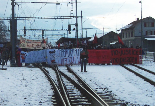 Daraufhin passierte der erste Zug die Kontrollstelle. Beim zweiten Zug, der Landquart verliess, sollten die DemonstrantInnen plötzlich doch aussteigen und sich einzeln kontrollieren lassen - was sie ablehnten. Die Demo in Davos fand somit nicht statt und die ZuginsassInnen kehrten nach Landquart zurück.