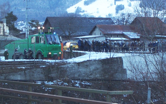 Sechs bayerische Wasserwerfer waren allein in Landquart eingesetzt. Die NZZ schreibt am Sonntag, dass der Einsatz möglich wurde "durch einen deutsch-schweizerischen Polizeivertrag, der am 1. März 2002 in Kraft trat." (Mehr zu diesem Vertrag hier). Und weiter: "Die Deutschen waren schon letzte Woche angerückt. Sie übten den Einsatz mit ihren Schweizer Kollegen auf einem Truppenübungsplatz in Chur."