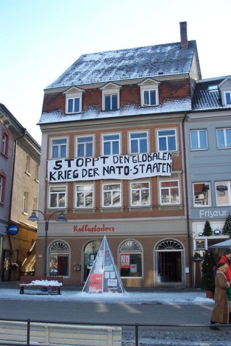 Das Ravensburger Antikriegsbündnis ist so aktiv wie heterogen. Es reicht von religiösen Gruppen bis zur MLPD, zur Demo am 15.2. rufen sogar Grüne, SPD und ÖDP mit auf. Eine wichtige Rolle spielt offenbar auch der Kulturladen Karacho, der Räume für Vorbereitungstreffen, Infos im Infoladen und eine Webseite bereitstellt