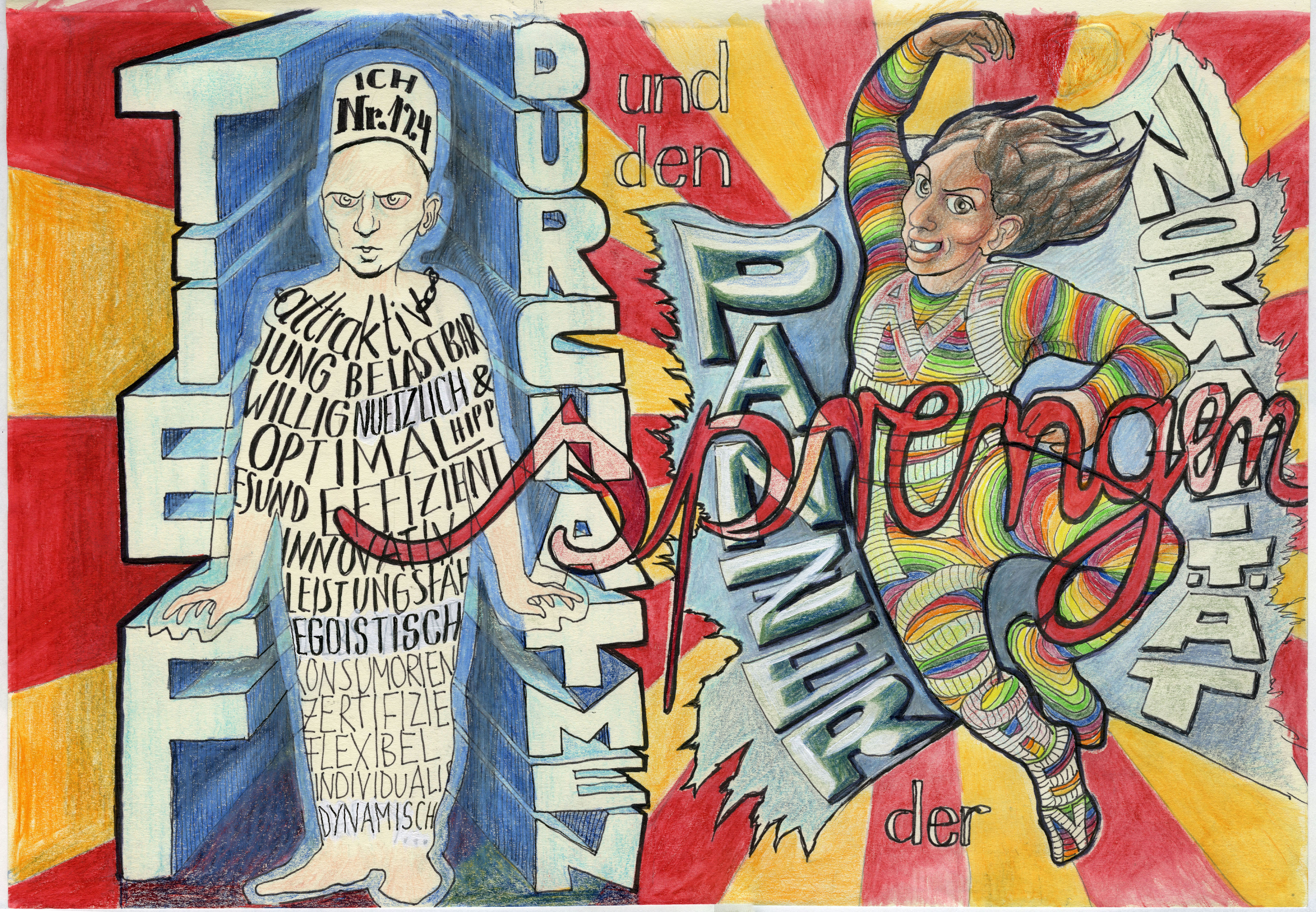 "Tief durchatmen und den Panzer der Normalität sprengen" Gestaltung: Sinje Kätsch, Oktober 2012 Bildschirmansicht Druckversion, jpg-Datei, Din A4, 300 dpi, ca. 5 MB |