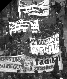 Der Militarismus der Außenpolitik findet sein Pendant in der immer repressiver werdenden Innenpolitik der imperialistischen BRD. Dies zeigt sich sowohl an den Verhaftungen und Hausdurchsuchungen vom 13.6.95, den Verbotsverfügungen von Kanther gegen die meisten kurdischen Organisationen oder das Verbot der Solidaritätsdemo vom 18.11.95 in Köln.