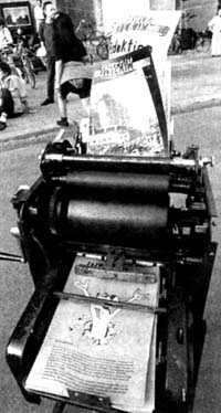 Da breitet sich über Jörgs Gesicht endlich Erleichterung aus. Gerade sind die zeitweilig verschwundenen Kartons aufgetaucht. Das verabredete Zwischendepot war von der Polizei beschattet worden, und so hatte der Druckerei-Bote die Kartons spontan bei einem Szeneprojekt geparkt, völlig unbewacht. Das Projekt strafte die Kartons dann einige Stunden mit Mißachtung. Zumindest in diesen Stunden hat das "Prinzip Interim" besonders eigenwillig funktioniert. Das von Schönbohms Häscher-Kolonnen nicht.